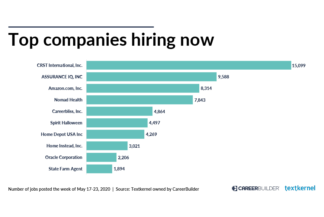 The top employers who need workers now are CRST International, Assurance IQ, Amazon, Nomad Health, and Careerbliss, among others. Click here to find a job at Amazon.