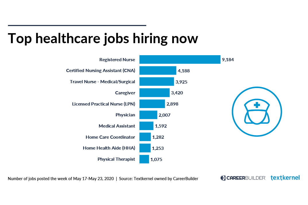 As many cities and states across the U.S. hit their coronavirus peaks, and businesses (including healthcare operations), start to re-open, a variety of positions are hiring again. Top healthcare jobs available now include registered nurse, certified nursing assistant (CAN), travel nurse, caregiver and licensed practical nurse. Find a healthcare job near you.