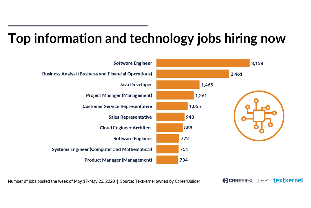 Top roles include software engineer, business analyst, java developer, project manager and customer service rep. Search for open IT jobs here.