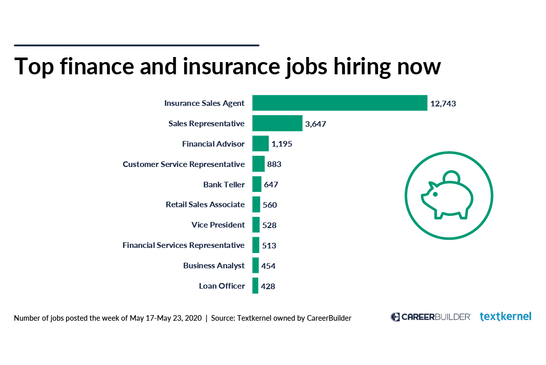 The finance and insurance industries have remained relatively stable throughout the COVID-19 pandemic, with many jobs available and the least number of layoffs. Top open roles include insurance sales agent, sales representative, financial advisor, customer service rep and bank teller. Search for available finance jobs, or search here for available insurance jobs.