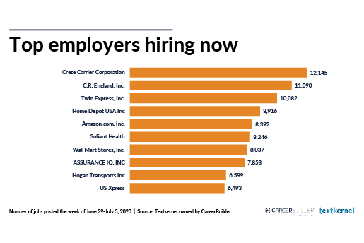 The top five companies with the most jobs available are Crete Carrier, C.R. England, Twin Express, Home Depot and Amazon. Find Home Depot jobs here or search for roles at Amazon.