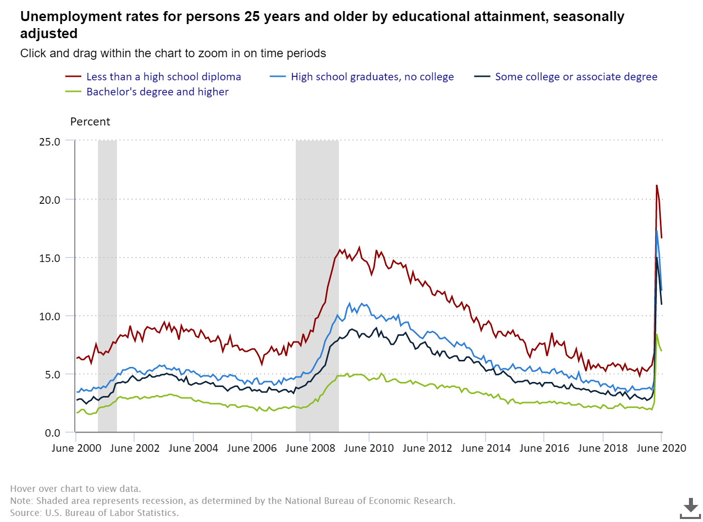 Education is still a strong buffer when it comes to unemployment – those with bachelor’s degrees and higher remain employed in larger numbers than those without higher education.