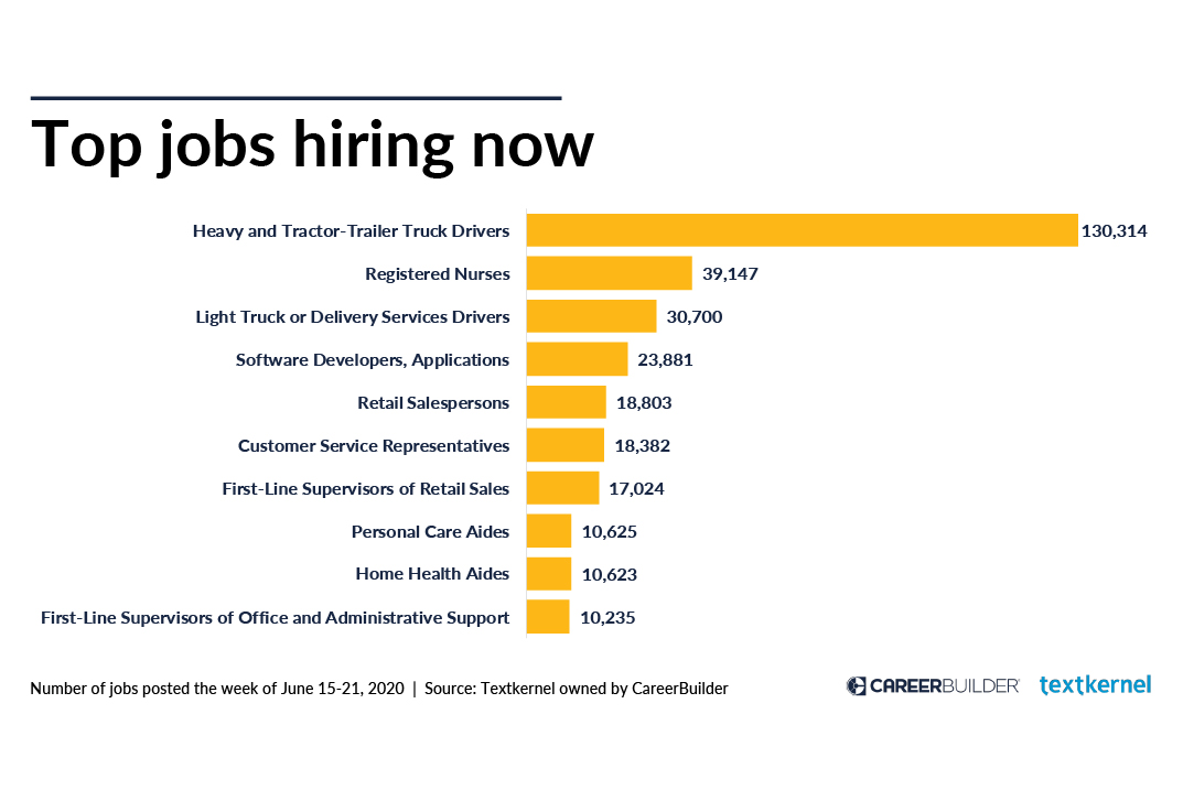 Again, trucking is big. With more than 130,000 roles open, find a job as a heavy/tractor-trailer truck driver. Next up: get hired as an RN. The next big three roles available are light truck/delivery services drivers, software developers and retail as.