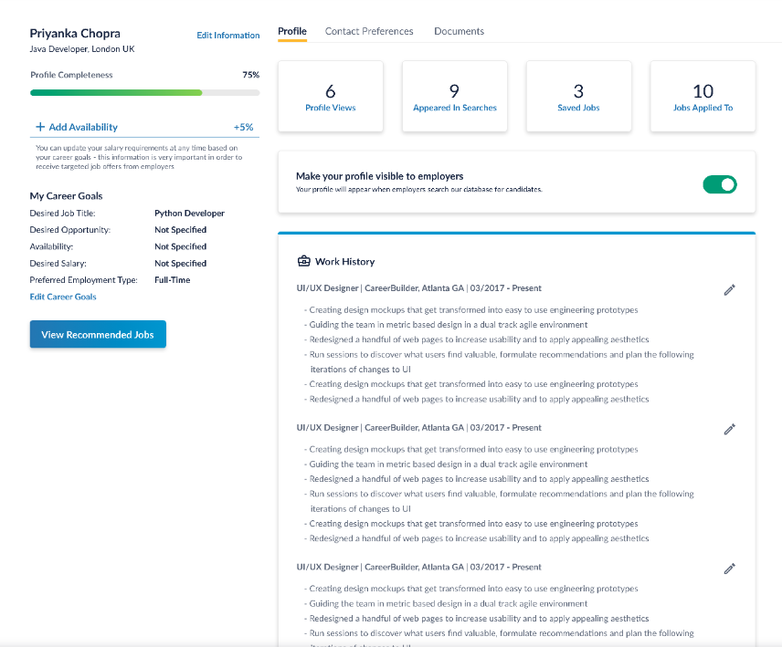 The new, modern experience helps you complete (or fine-tune) your profile to let employers know you’re actively looking for a new job. Add your availability, skills and salary requirements to filter out jobs that don’t fit your career path. By keeping your profile up-to-date, your job recommendations will be more accurate.