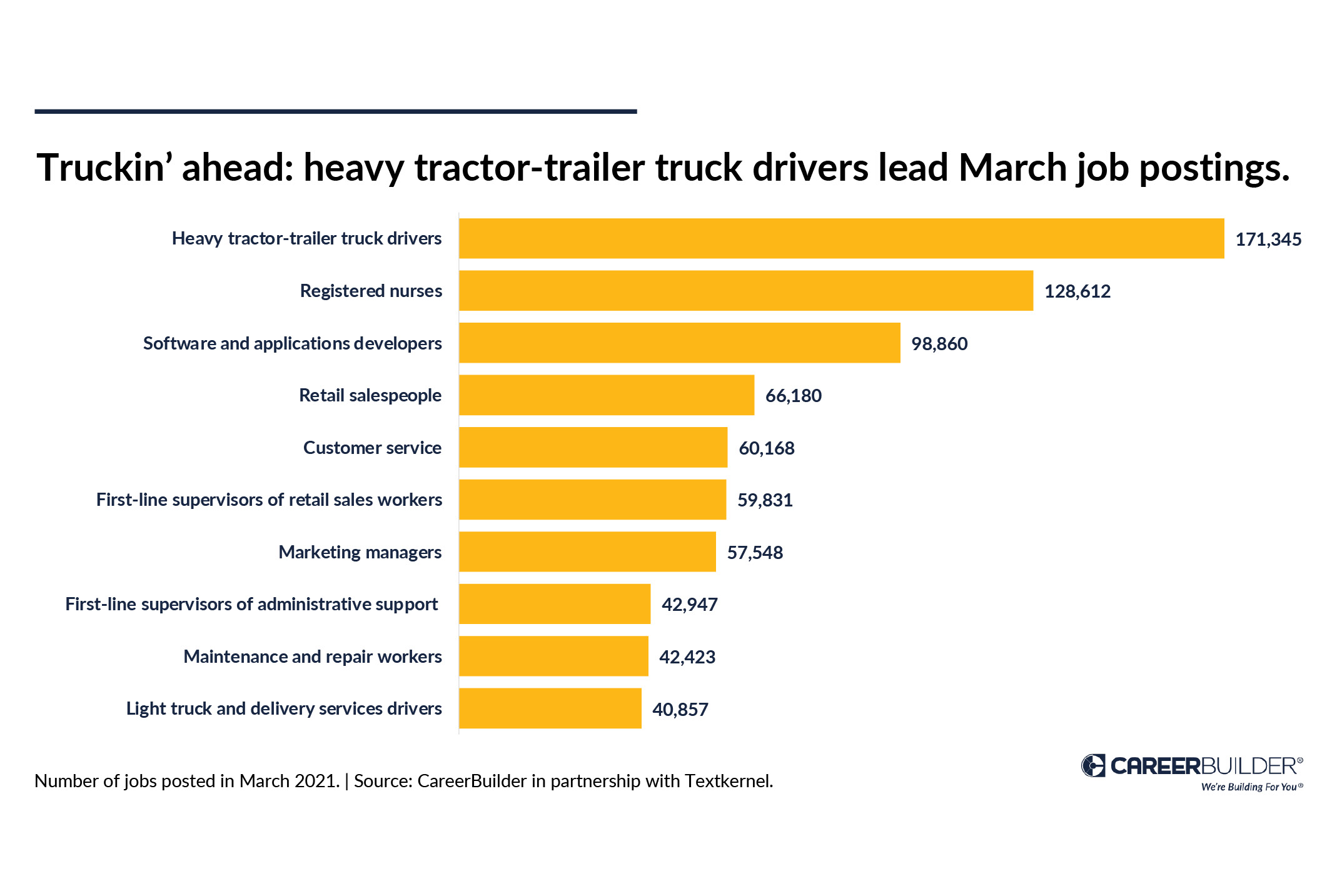 Heavy tractor-trailer drivers cruised into the lead for job postings in March. If you’re ready to get your rig on the road, click here to find your next trucking job. Not exactly a road hog? No worries. Here are the other top jobs available now: