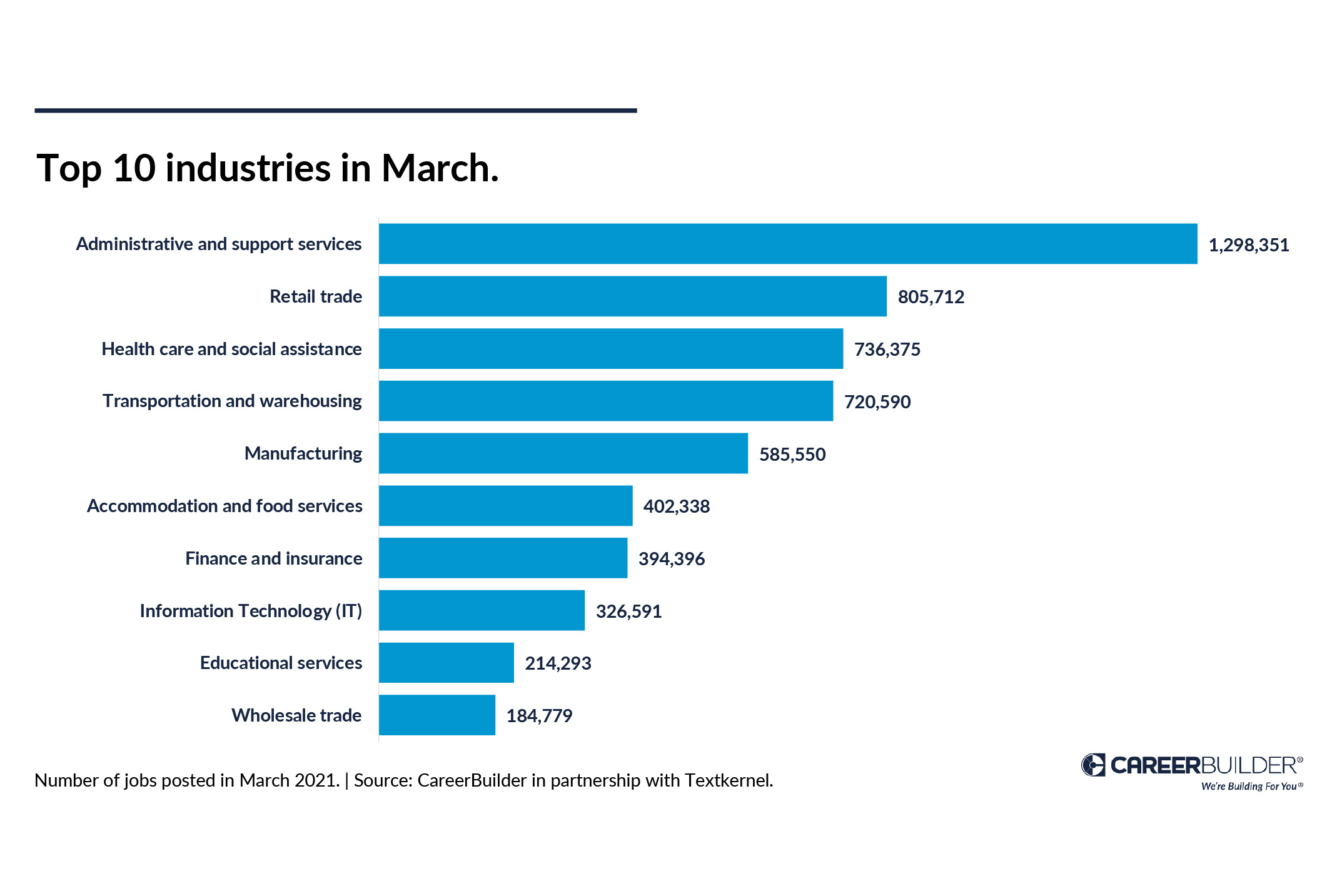 Administrative and support services jobs—including everything from personal assistants to tree trimmers—far outpaced other industries, so clean up those calendars (or sharpen those shears). Here are the other top industries hiring now: