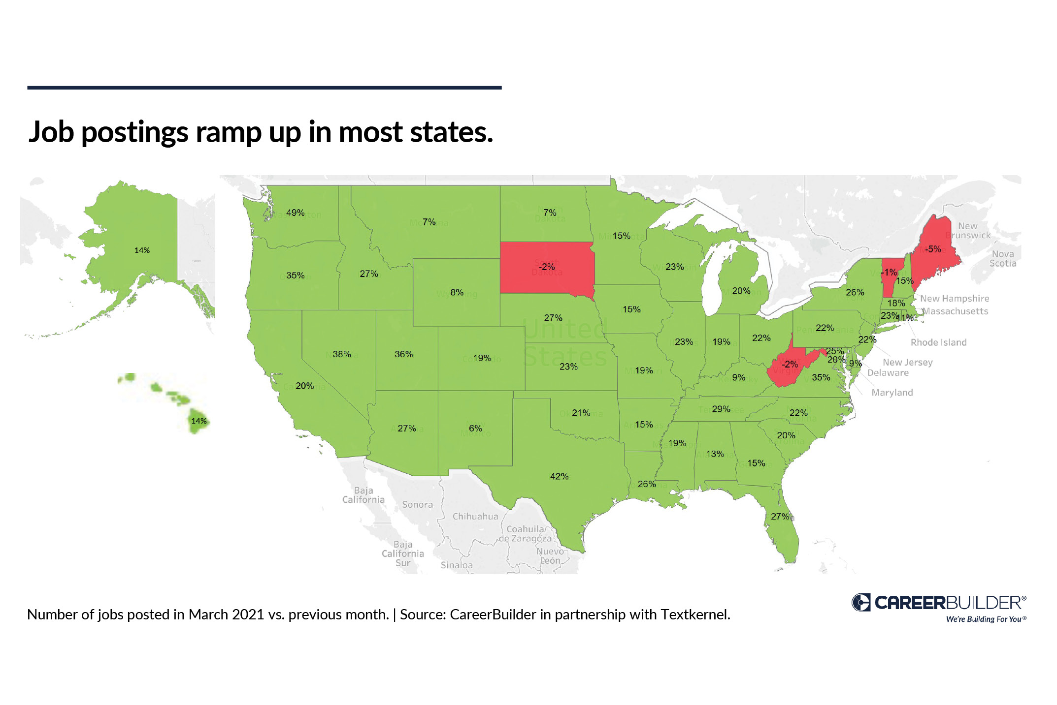 The job market is healing across the country, with the majority of states adding more job postings. But a few stand out: Washington added a whopping 49%, with Texas (42%) and Rhode Island (41%) close behind.