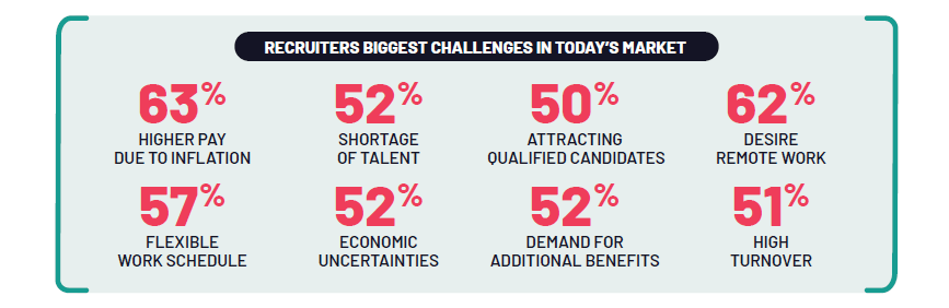 Recruiters face a variety of challenges in today’s market, the biggest being the demand from candidates for higher pay due to inflation (63%) and a shortage of talent (52%). In that same vein, many claim attracting qualified candidates for open roles is their biggest obstacle (50%). Other key market challenges include: candidate desire for remote work (62%) a flexible schedule (57%), economic uncertainties related to a potential recession (52%), demand for additional benefits (52%), and high turnover (51%).