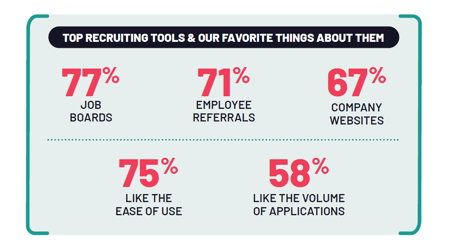 Beyond Job Boards which the vast majority claim to leverage to find candidates (77%), employee referrals (71%) and company websites (67%) are also commonly used, with ease of use (75%) and the volume of applications (58%) being Recruiters’ favorite things about the job boards they currently use.