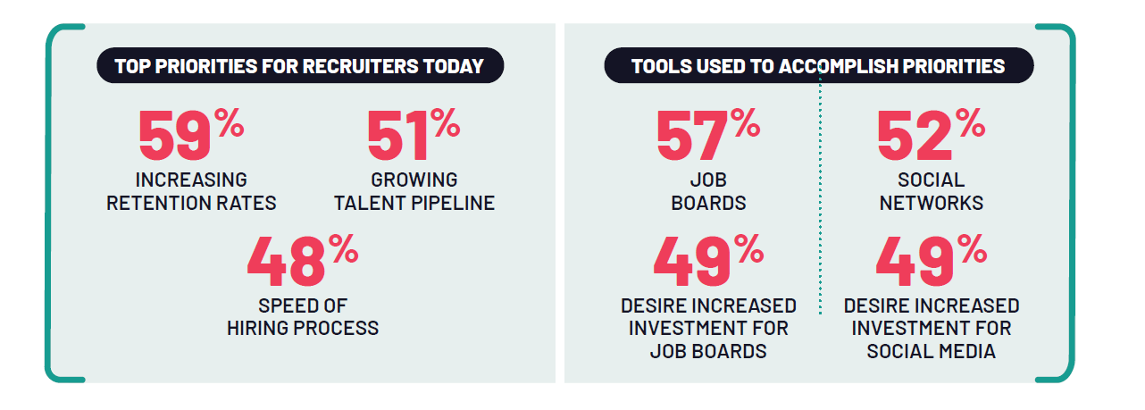 In light of these challenges, organizations have flagged several top priorities for recruiting including increasing retention rates (59%), growing the talent pipeline (51%), and improving the speed of the hiring process (48%). Job Boards (57%) and Social Networks (52%) are top tools many leverage to accomplish these priorities, with many claiming increased investments in these areas as well (50% claiming increased investment for social media, 49% for job boards).