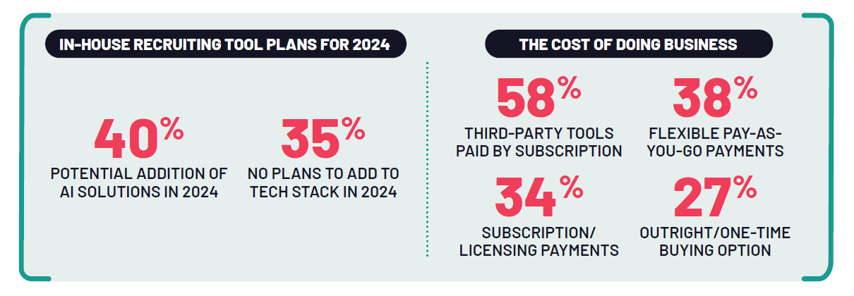 When it comes to in-house tools, the potential addition of AI solutions in 2024 tops the list (40%), while the next highest group of recruiters (35%) have no plans to add to their tech stack in the next 12 months. Current 3rd party tools/solutions are largely paid for via subscription/licensing payments (58%), though preference for how they pay for these types of tools is split: flexible/ pay as you go payments (38%) are the top preferred followed closely by subscription/licensing payments (34%) and outright/one time purchasing (27%).