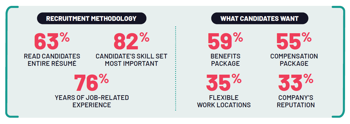 When it comes to working with candidates, over half of hiring managers read candidates entire resume (63%), with the most important things they look for on a resume being the candidate’s skills (82%) and the years of experience they have related to the role (76%). When asked specifically about candidates they work with, unsurprisingly, benefits (59%) and compensation (55%) are the top things noted as getting new hires most excited about joining a company. Flexible work location options (35%) and a company’s reputation (33%) are also important.