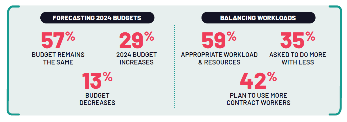 Despite uncertain economic conditions over the last year, many recruiters said that their 2024 recruiting budget remains the same (57%), with more noting budget increases vs. decreases (29% vs. 13%). Beyond budgets, most feel that they have an appropriate amount of workload and resources available to accomplish the tasks they are responsible for (59%), though 35% have been asked to take on more with fewer resources in the past year. While more recruiters plan on sticking with full-time vs. part-time employees, 42% said they plan to use more contract workers in 2024.