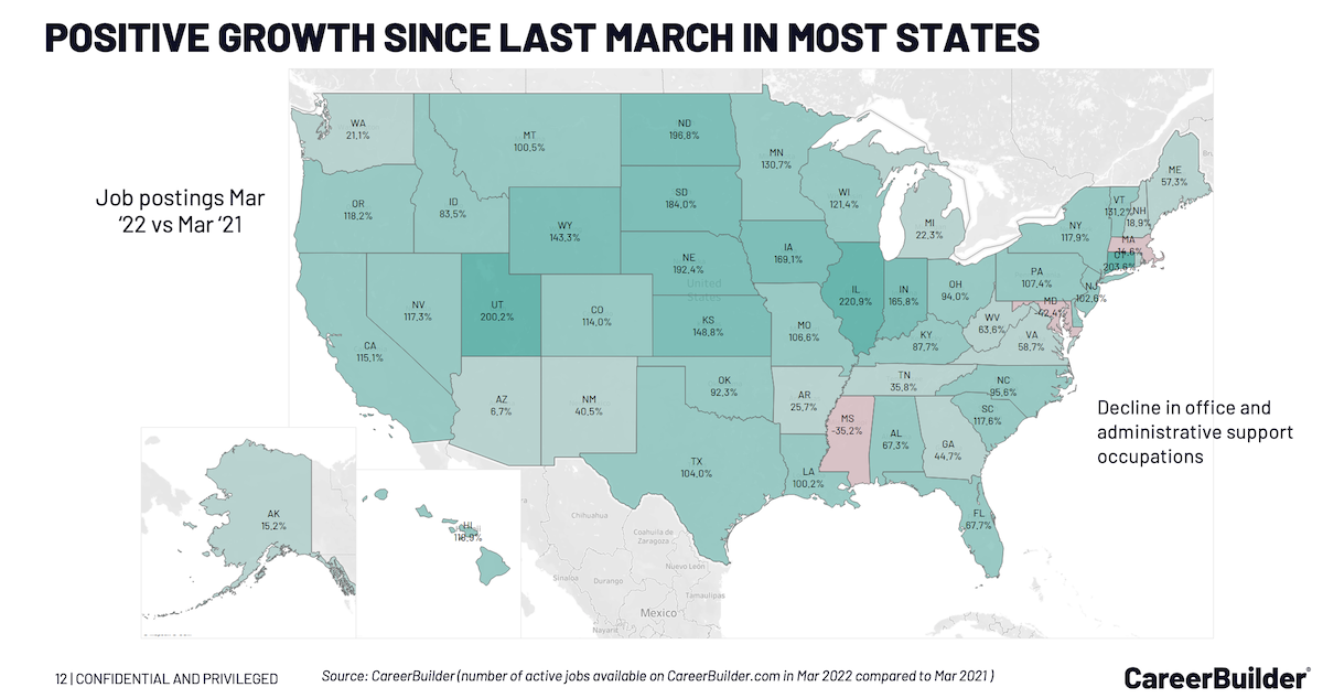 Most Major job groups show strong double- to triple-digit growth in March 2022 as compared to the same period last year. Transportation, Warehousing, Healthcare, Sales, and Office continue to drive job posting volume, but we are also starting to see significant demand in the following groups: