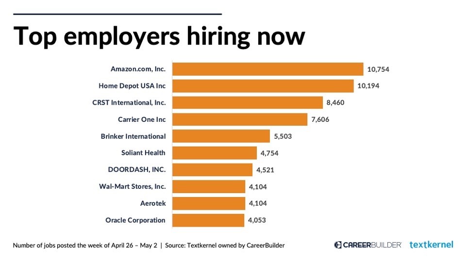 The top employers who need workers now are Amazon, Home Depot, CRST International, Carrier One and Brinker International, among others. Click here to find a job at Amazon or look here for open roles at Home Depot.