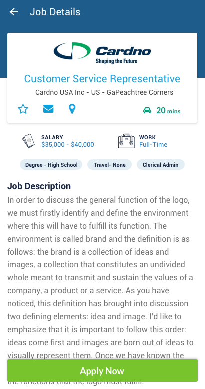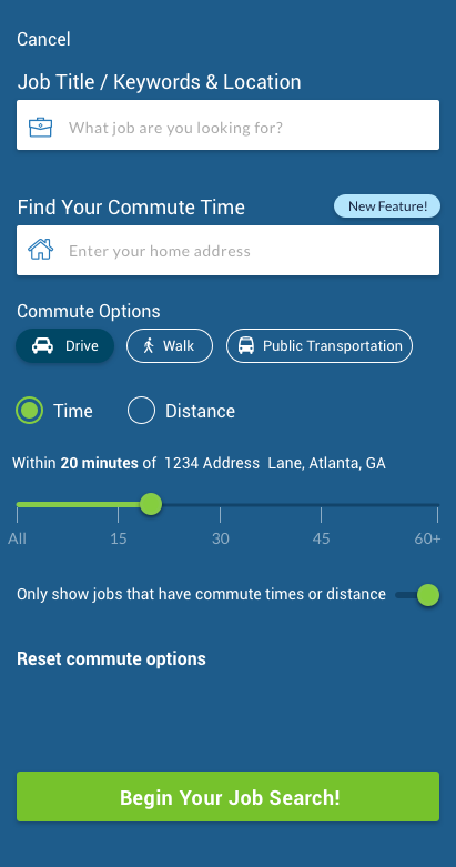In the coming weeks, CareerBuilder’s Job Search mobile app [Play App Store] will let job seekers include expected commute time into their search criteria. By using Google Cloud Jobs API, the commute search functionality can either use the mobile device’s GPS (with the job seeker’s permission) or a specific address as the starting point. Then, by choosing mode of transportation (walking, car or public transit) and desired commute time, the job seeker will receive the job search results that fit their criteria.