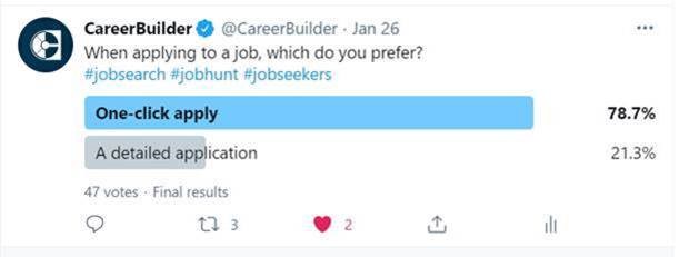 Unsurprisingly, the majority of responses favored a simple 1-click application over a detailed one. According to our informal Twitter poll, almost 79% of respondents want an easy apply path:
