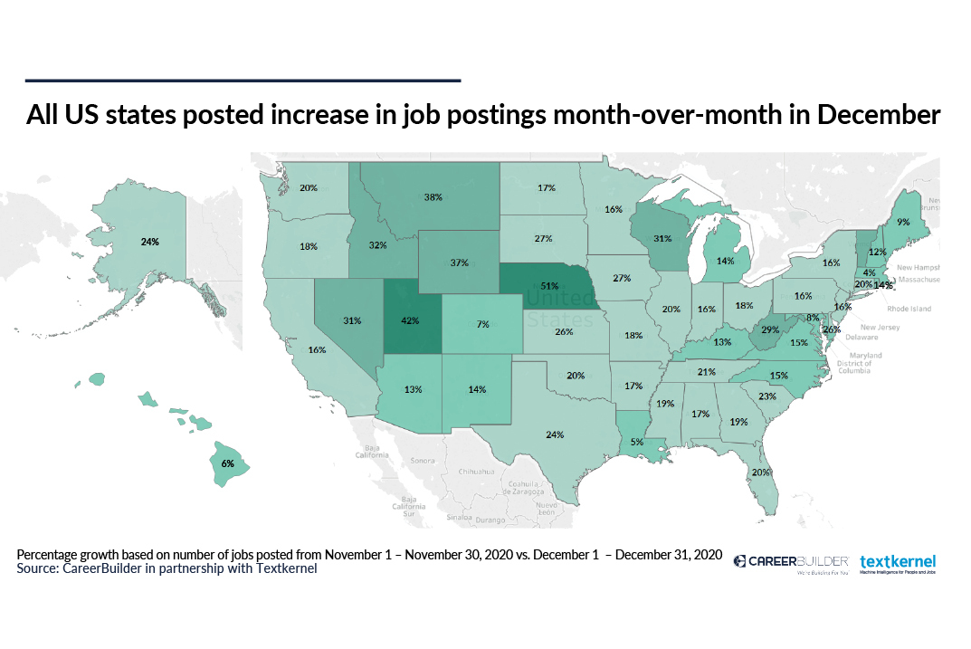 While every state experienced an increase in job postings, Utah and Nebraska had the highest growth in December.