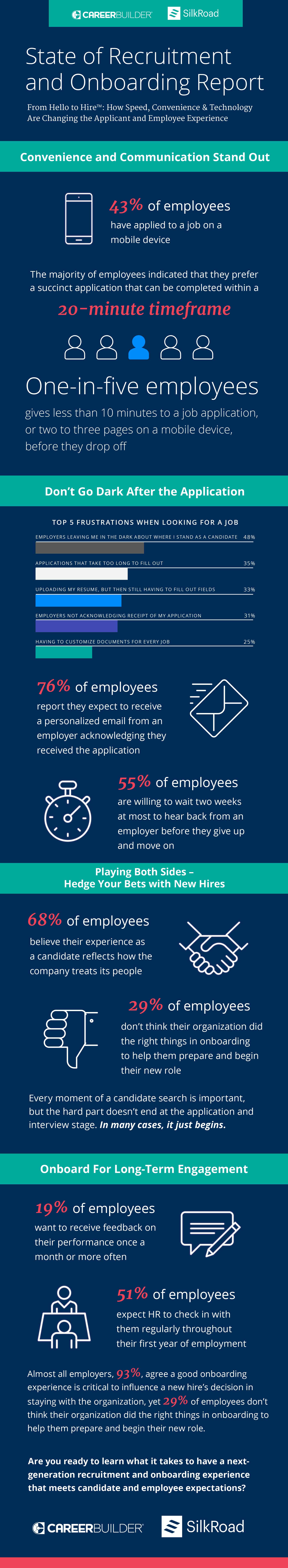 SilkRoad and CareerBuilder commissioned a study that captures the experiences and preferences of employees and employers and spans the transition from candidate to new employee. Check out the below infographic for key insights, and download the full report for an in-depth look at what candidates – and employees – want.