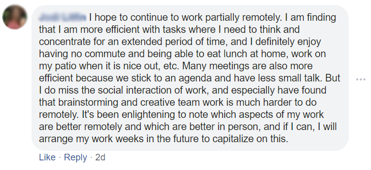 But – several said they would like a mix of work from home and in-office time. The employees who are skeptical about work from home can provide valuable insights to HR teams and managers. The future of work is flexible, and companies can start preparing for how physically distant offices should function, from promotions to guidelines for socializing and running meetings.