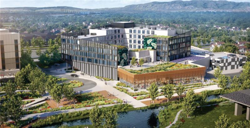 M Social Hotel is designed to be a landmark hotel for Millennium Hotels and Resorts. The project is being developed in conjunction with Lakeside Apartments along with a public park and lake that connect the two projects. The design of the hotel offers a visually striking refuge for travellers. The massing steps down towards the East for improved views, while allowing natural light into the core of the hotel. The first floor offers a restaurant, bar, lounge, pre-function space, multiple meeting rooms, two ballrooms, commercial kitchen, and a centrally located courtyard that connects the common areas. The hotel provides 263 keys and, in addition to the first floor, offers visitors a fitness centre and outdoor lounge. Sitting close to the 101 Freeway, the hotel will serve as a convenient option for travellers arriving from nearby San Jose Mineta International Airport.